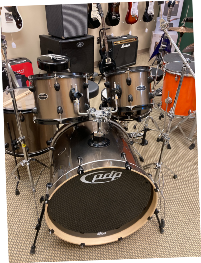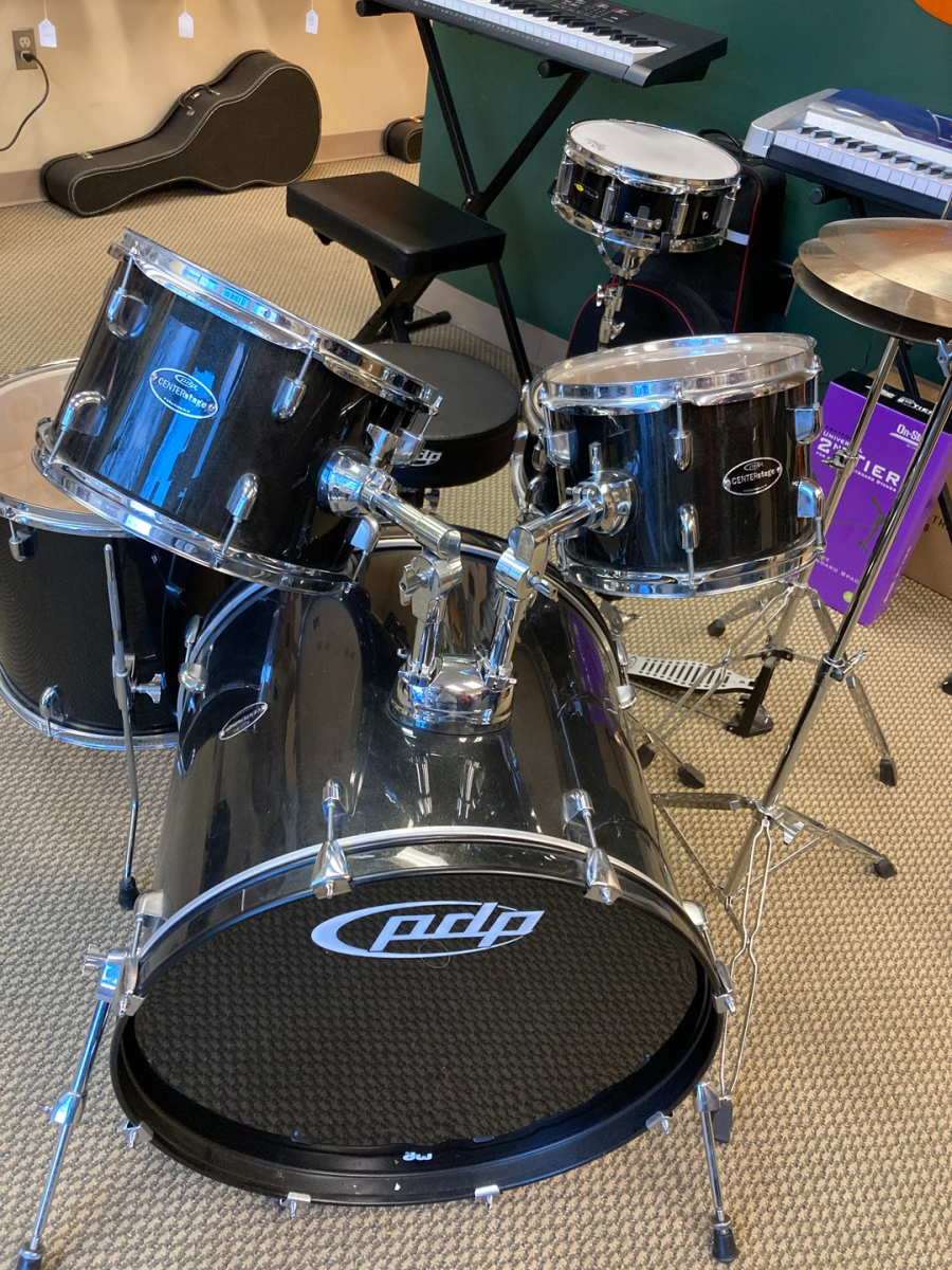 Metallic Black, 22" bass, 12" and 13" mounted toms, 14" snare, 16" floor tom, throne